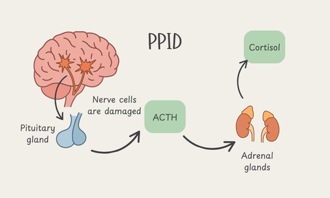In horses with PPID, the brain produces too much of the hormone ACTH. ACTH causes the adrenal glands to produce cortisol. Normally this process stops once enough cortisol is in the blood, but in PPID this brake no longer works. The increase in cortisol also makes the cells less sensitive to insulin.