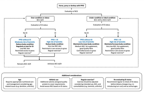 Figure 1 shows an overview for assessing and managing horses, ponies, and donkeys with PPID. The chart helps tailor feeding and management decisions to body condition (BCS) and the presence of insulin dysregulation (ID).